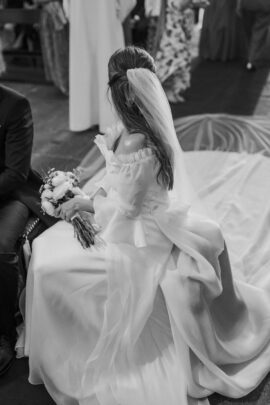 La boda en Madrid de Gabriela, la novia del vestido con cola de camelias